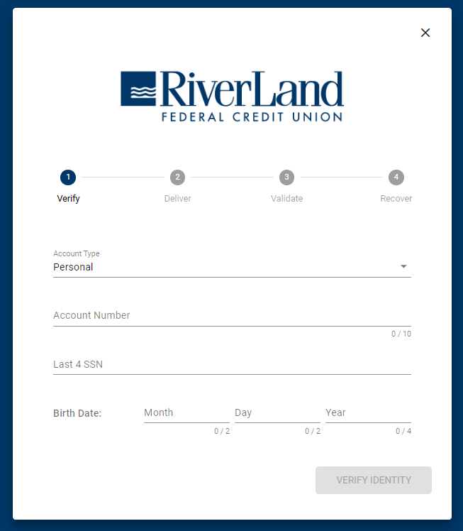 Account Number: enter your primary account number with no hyphens, dashes, or suffixes. You can find your account number on the Membership Cards either given or mailed to you after joining RiverLand.