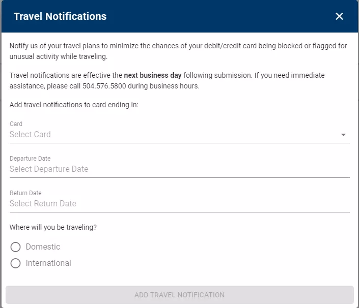 Select whether you are traveling Domestic (within the United States) or International. Then, select the specific country/state. If you are traveling to multiple locations, you can send us a message through online banking to add more details.